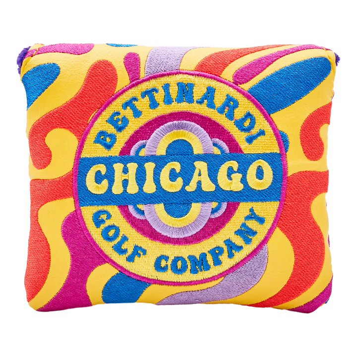 Far out! This mallet putter headcover features our embroidered Groovy Bettinardi patch on the top and a colorful lava pattern throughout. Stitched on a yellow base, this headcover looks smashing on any mallet putter. Finished with a plush purple interior to keep your putter protected. Limited quantities are available.